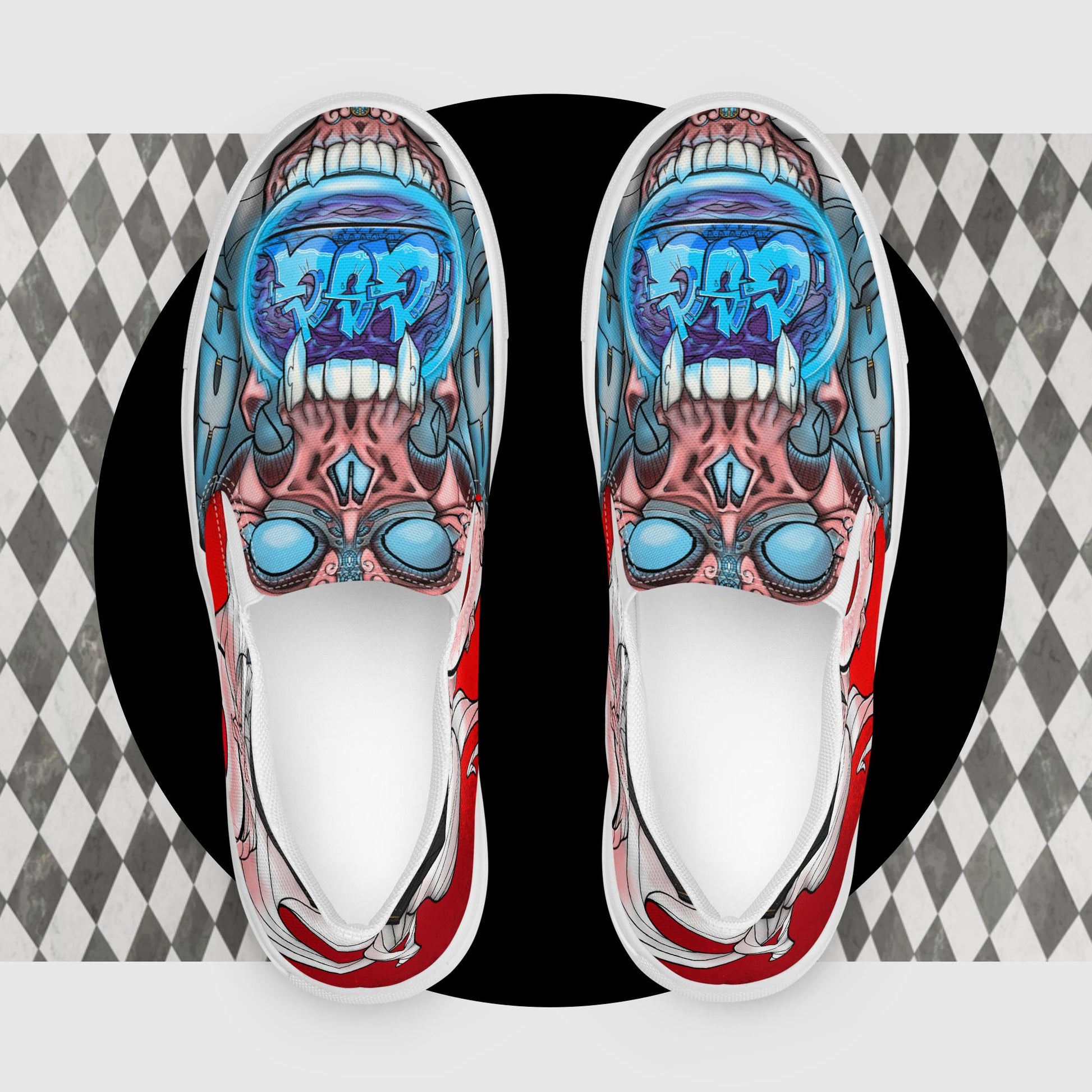 Introducing the newest artist to the GSG Team! These are cus to, design made by an amazing artist and great friend who goes by MF LUNCHBOX! This design is completely original and you will not find another pair of shoes like these anywhere else!Made for comfort and ease, these Men’s Slip-On Canvas Shoes are stylish and the ideal piece for completing an outfit. Equipped with removable soft insoles and rubber outsoles, it’s also easy to adjust them for a better fit.